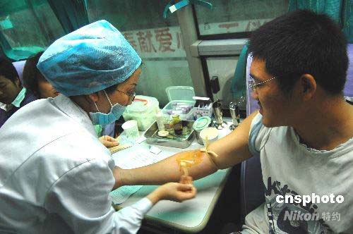 5月14日,重慶市西南大學(xué)育才學(xué)院近500名同學(xué)冒著大雨排隊獻血。重慶市合川區(qū)血液中心來到校園進行采集血液,引起了大量學(xué)生的踴躍報名獻血,場面一度失控。同學(xué)們血脈相通汶川,紛紛表示了對災(zāi)區(qū)人民的慰問之情。血液中心負責(zé)人介紹說,當(dāng)天采集了200余名學(xué)生的血液,將馬上運送到最需要的災(zāi)區(qū)。中新社發(fā) 許康平 攝