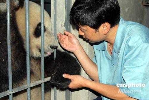 5月24日,來自四川臥龍的8只大熊貓平安抵達(dá)北京動(dòng)物園,開始新的生活。此次進(jìn)京的8只奧運(yùn)大熊貓,是今年3月21日啟動(dòng)的“2008四川臥龍大熊貓奧運(yùn)北京行”投票評(píng)選活動(dòng)中,由廣大網(wǎng)民從16只大熊貓里選出來的。這8只熊貓,雌雄各半,現(xiàn)在的年齡都在1歲9個(gè)月之間,屬亞成體,正是最活潑可愛的年華。臥龍飼養(yǎng)員在京對(duì)在地震中受驚嚇的熊貓美欣進(jìn)行心理?yè)嵛。中新社發(fā) 羅小韻 攝