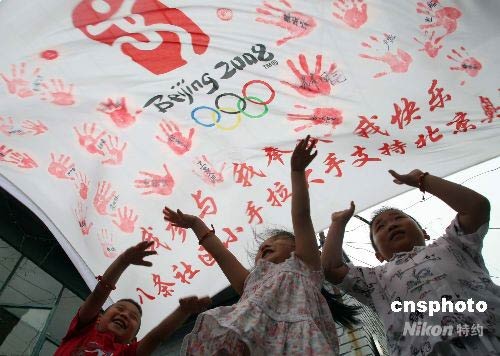 6月17日,距離北京奧運會還有52天,北京奧林匹克社區(qū)的50多位市民聚集在一起,在印有奧運會會徽的旗幟上印下自己的手印,共同迎接奧運會倒計時50天。 中新社發(fā) 杜洋 攝