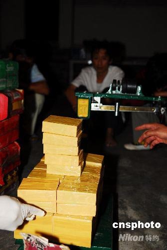 2008年6月20日,云南省臨滄市公安局禁毒支隊(duì)成功破獲一起特大販毒專案,繳獲毒品海洛因236塊,重計(jì)84.27千克,抓獲涉案犯罪嫌疑人10名(其中甘肅籍4名,云南大理籍1名、臨滄籍5名),繳獲單管獵槍、勃蘭寧手槍各1支,各類子彈150發(fā),運(yùn)毒車5輛及一批涉案臟物。該案是今年云南省破獲的最大一起海洛因販毒案件。中新社發(fā) 李春俊 攝