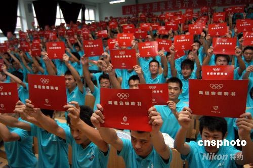 圖:濰坊志愿者領(lǐng)取北京奧運(yùn)會安保聘書