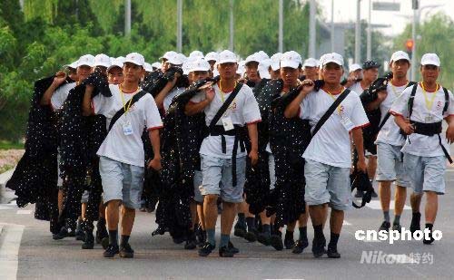 7月20日,北京奧運(yùn)會(huì)開(kāi)幕式演職人員帶著道具走進(jìn)“鳥(niǎo)巢”。離奧運(yùn)開(kāi)幕越來(lái)越近,北京國(guó)家體育場(chǎng)“鳥(niǎo)巢”里正加緊開(kāi)幕式的彩排工作。中新社發(fā) 王東明 攝