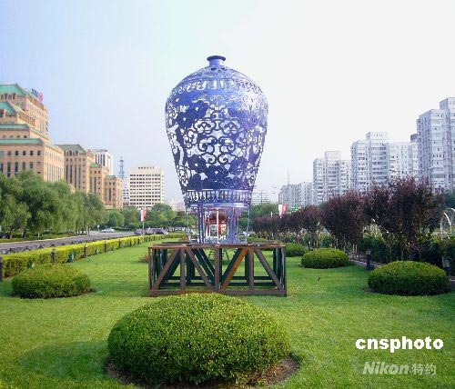 7月20日,一個(gè)高4米左右的“青花瓷”瓶奧運(yùn)花壇在北京長安街亮相,其清新典雅的“芳姿”成為一道別致風(fēng)景。中新社發(fā) 玉龍 攝