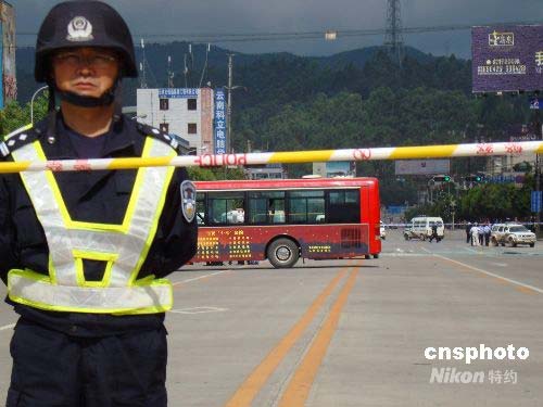 7月21日上午7時10分、8時05分左右,在云南省昆明市人民西路云大醫(yī)院側門、昌源路與人民西路交叉口分別發(fā)生公共汽車爆炸案。圖為警方在昌源路與人民西路交叉口爆炸現(xiàn)場拉起警戒線,禁止一切行人車輛通過。中新社發(fā) 楊洋 攝