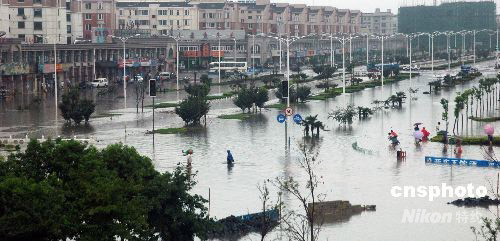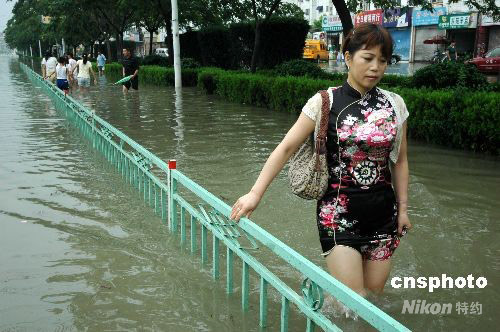 2008年7月31日20時起,受今年第8號臺風 “鳳凰”外圍的云系和風力影響,“鳳凰”雨襲擊安徽巢湖市。至8月1日15時,“鳳凰”雨狂襲安徽巢湖市城區(qū),降雨量已超過240mm以上,造成市內多處低洼地段發(fā)生嚴重內澇,部分街道成了一片汪洋,大部分路段被水淹沒,進入市區(qū)的高速路口因積水過深臨時封閉,給群眾出行和生活帶來了很大影響。此次長時間的強降水,給該市城區(qū)防洪排水帶來壓力。中新社發(fā) 徐振華 攝