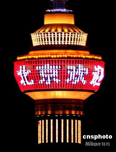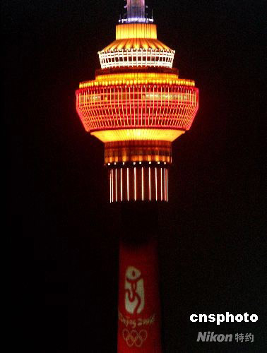 8月1日晚,北京中央電視塔奧運主題夜景燈光以“燈籠”造型為主體,將405米高的世界高塔裝扮得美輪美奐,無比壯觀,成為京西一道綺麗奪目的風景。中新社發(fā) 趙振清 攝
