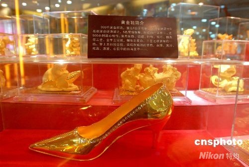 發(fā)表評論  9月3日,在遼寧沈陽一黃金商店的柜臺內(nèi),一只一公斤重的純金高跟鞋吸引了很多顧客的目光。這只金鞋使用999千足金打造,5名技師歷經(jīng)48個工作日才完成。中新社發(fā) 孫海 攝