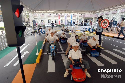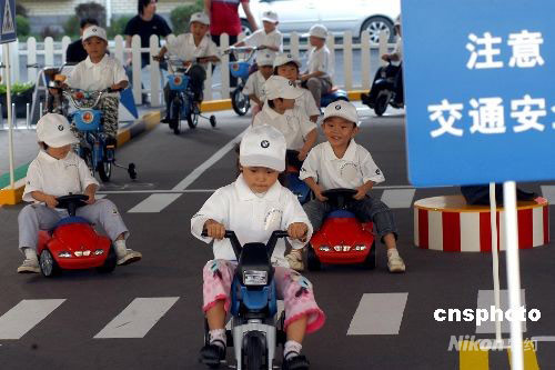 9月11日,為期三天的2008BMW兒童交通安全訓(xùn)練營沈陽站在和平區(qū)少年宮開營。在BMW兒童交通安全主題公園里,十字路口、交通崗、紅綠燈、斑馬線、雙黃線、警示牌等一應(yīng)俱全。來自沈陽多所幼兒園的80名孩子駕駛著玩具寶馬汽車、摩托車和自行車行駛在這一個(gè)“縮小版”的繁華街道上。中新社發(fā) 文契 攝