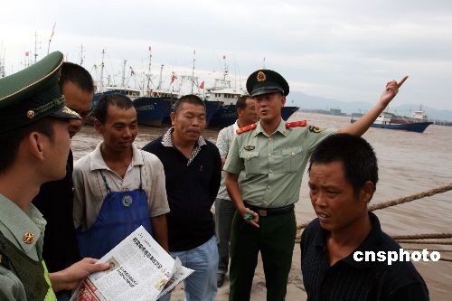 9月30日,邊防官兵在溫州飛云江漁港向待臺風(fēng)“薔薇”警報(bào)解除后出海的漁民通報(bào)外輪“HELIOS 3”號船在溫州南麂海域沉沒情況,提醒漁船在出海后注意發(fā)現(xiàn)遇險(xiǎn)人員及漂浮物。 9月29日下午2時(shí)許,在巴拿馬注冊的韓國貨輪“HELIOS 3”號船從緬甸載6000噸原木前往浙江嘉興港,在航經(jīng)溫州南麂島以南約5海里處時(shí),受臺風(fēng)“薔薇”影響,船上貨物移位,造成兩艙進(jìn)水發(fā)生險(xiǎn)情后沉沒,船上共有韓國、緬甸、印尼等國家地區(qū)的外籍船員15名。海上搜救部門立即啟動(dòng)應(yīng)急預(yù)案,當(dāng)晚有2名外籍船員在救生筏上被一艘路過的船舶救起,其余13名遇險(xiǎn)外籍船員仍在搜尋之中。中新社發(fā) 蔡寬元 攝