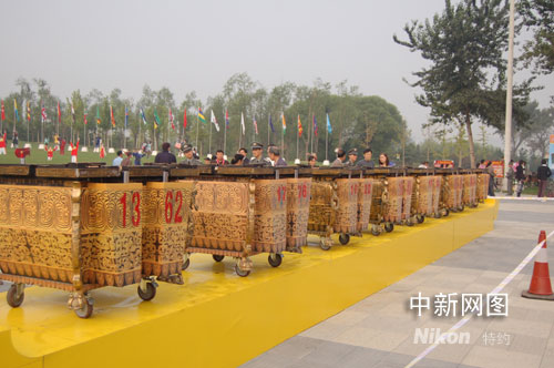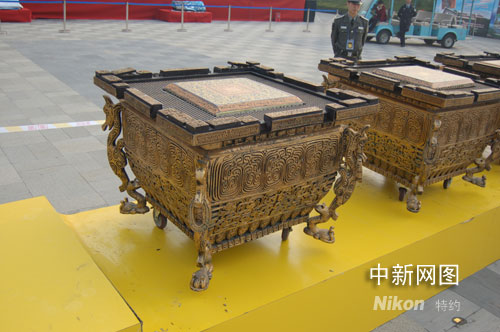 奧運(yùn)開幕式道具—缶在北京朝陽國際旅游文化節(jié)上亮相,吸引游客駐足觀賞。張濛 攝