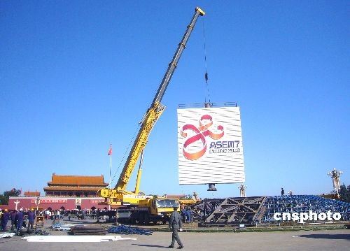 2008年10月27日上午,北京天安門廣場(chǎng),施工人員開始吊卸第七屆亞歐首腦會(huì)議標(biāo)識(shí),整個(gè)中心花壇的拆除工作正在加緊進(jìn)行,預(yù)計(jì)將于今晚全部拆卸完畢。今年的天安門廣場(chǎng)花壇布置從7月5日開始施工,經(jīng)歷奧運(yùn)會(huì)、殘奧會(huì)、國(guó)慶、第七屆亞歐首腦會(huì)四個(gè)時(shí)期,至今已歷時(shí)3個(gè)多月。這是自1986年廣場(chǎng)擺花以來(lái),史無(wú)前例的。中新社發(fā) 玉龍 攝