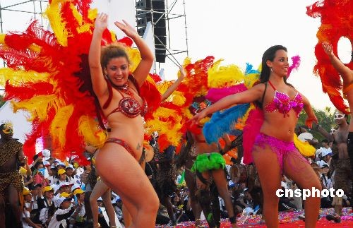 2008年11月16日,在海南省文昌市舉行的第九屆中國海南島歡樂節(jié)“狂歡大巡游”中,來自巴西的桑巴舞陣,將濃濃的異域風(fēng)情帶到海南。中新社發(fā) 善平 攝