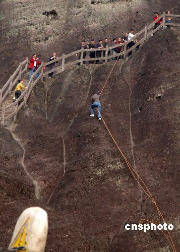 2008年11月17日,福建自然風(fēng)景名勝武夷山每天都吸引許多游客前來游玩,然而許多游人隨手丟棄的旅游垃圾醒目地散落在秀麗的山間上,為了保護景區(qū)環(huán)境,工作人員只好在高達800米陡峭的山間中拾垃圾,被游人喻為武夷山上的“蜘蛛人”。中新社發(fā) 張斌 攝