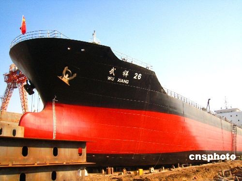 11月20日,一艘由中國農(nóng)民制造的最大貨船,屹立在南京浦口“十里造船帶”的造船廠碼頭準備下水。這艘由“中華民間造船水運第一村”南京武家嘴村農(nóng)民制造的貨船載重1.6萬噸、長146.2米、寬22米、進深11米,是迄今全國農(nóng)民中造出的最大貨船。中新社發(fā) 谷昌旺 攝