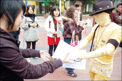 兩名大四學(xué)生扮怪相,用行為藝術(shù)反映求職難。韓立山 攝