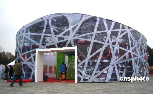2008年12月3日,由噴繪布模擬搭建的山寨版“鳥巢”展廳正式在北京地壇書市的方澤壇活動區(qū)亮相,游客競相入內參觀。不過這個建筑可不是用來進行體育比賽的,本屆書市的展覽、法律咨詢等活動都在這里進行。中新社發(fā) 玉龍 攝