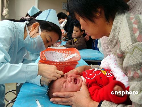 2008年12月4日,蘇州市兒童醫(yī)院的醫(yī)護(hù)人員在為患兒輸液。當(dāng)日,受北方冷空氣影響,蘇州氣溫大幅下降,來(lái)醫(yī)院就診的患兒也比平時(shí)增加四成左右,大部分患兒是由于受涼而引發(fā)感冒、發(fā)燒等不適。中新社發(fā) 王建康 攝
