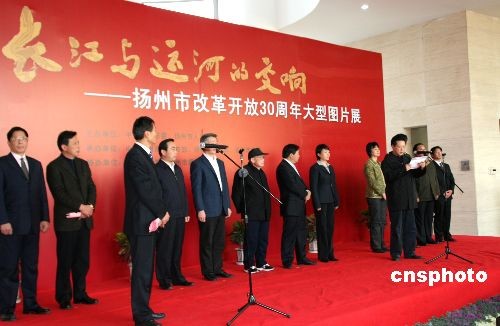 12月9日下午,長江與運河的交響——揚州紀念改革開放30周年大型圖片展在揚州雙博館隆重開幕。圖片展從“親切關懷”、“揚州名片”、“富裕揚州”、“秀美揚州”、“文明揚州”、“法治揚州”、“和諧揚州”、“堅強領導”等八部分共展出600余幅照片,全面展示了黨的十一屆三中全會以來揚州在經濟、政治、文化、社會等各方面的歷史進程、重大事件和豐碩成果,見證了中國特色社會主義理論在揚州的成功實踐。揚州市委書記季建業(yè)、市委副書記、市長王燕文、市委副書記洪錦華等領導出席。市委常委、宣傳部部長袁秋年主持開幕式。展覽從2008年12月9日至2009年1月10日止。中新社發(fā) 崔佳明 攝