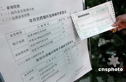 圖為北京一些郵局已專設(shè)臺灣郵件處理通道,一工作人員正在展示剛領(lǐng)到的海峽兩岸直接通郵單。