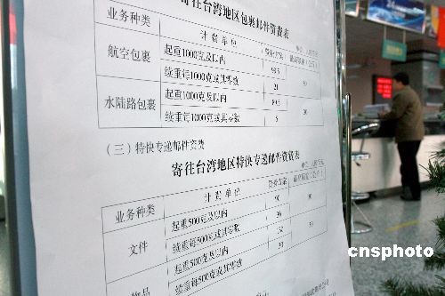12月15日,海峽兩岸全面直接通郵正式開通,目前,各項準(zhǔn)備工作也已經(jīng)就緒。當(dāng)日起,兩岸將通過空運或海運直航方式將郵件總包送至對方郵件處理中心,這標(biāo)志著兩岸全面、直接、雙向通郵正式實施。屆時,中國郵政集團公司將全面開辦兩岸郵政業(yè)務(wù)和郵政匯兌業(yè)務(wù),大陸6萬多個郵政網(wǎng)點原則上也將同步開展兩岸函件、包裹、特快專遞及郵政匯兌業(yè)務(wù)。中新社發(fā) 鄭雄增 攝