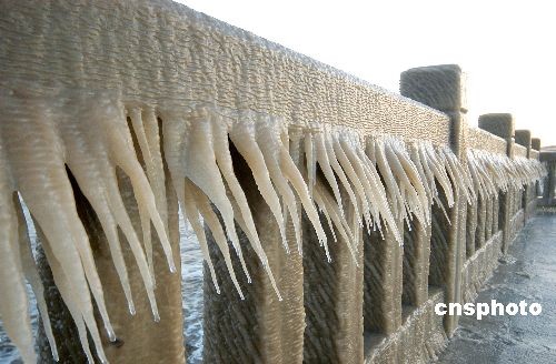 12月22日,連云港受強(qiáng)冷空氣影響,最低氣溫零下8攝氏度。在西北大風(fēng)作用下海上生成了滔天巨浪,濺在海岸邊護(hù)欄上的海水凍結(jié)成了晶瑩剔透的冰凌,沙灘上也是白茫茫的一片雪地,給寒冬里的連云港海濱增添了一道生態(tài)風(fēng)景線,不少游人觀賞到難得一見(jiàn)的景觀。中新社發(fā) 王春 攝