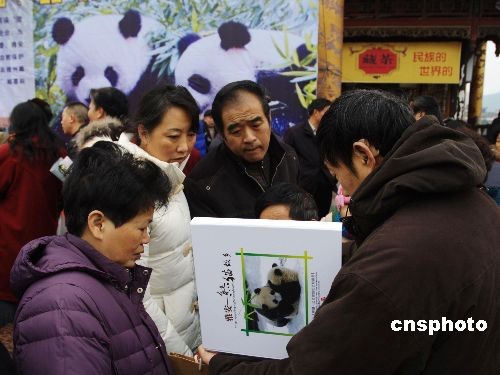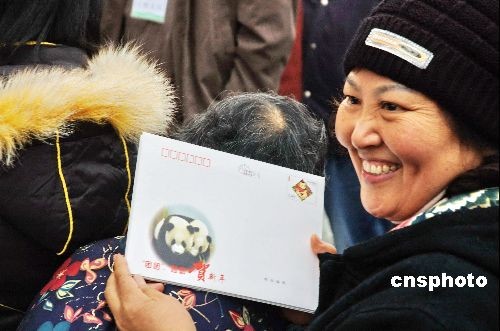 12月23日,四川雅安市發(fā)售贈(zèng)臺(tái)大熊貓團(tuán)團(tuán)圓圓相關(guān)郵品。市民排隊(duì)熱情購(gòu)買,雅安市委副書記張錦明、副市長(zhǎng)譚向紅等現(xiàn)場(chǎng)為市民簽名售郵品。中新社發(fā) 張國(guó)軍 攝