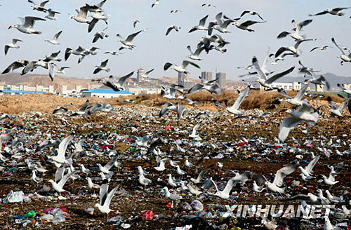 12月22日,成群海鷗在遼寧省大連市毗鄰海岸的一處垃圾場(chǎng)上覓食。連日來(lái),受寒潮襲擊,大連市氣溫急劇下降近10攝氏度,致使渤海灣金州西海岸近海灘涂大面積結(jié)冰。生活在這里的海鷗突遇“糧荒”,不得已選擇毗鄰海岸的城市垃圾場(chǎng)覓食。新華社發(fā)(徐德武 攝)