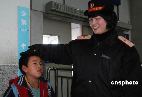 2008年12月25日,蘇州火車站更換了一批兒童票身高標識牌。據(jù)了解,從12月21日起鐵道部決將乘坐火車時購買兒童半價票的參照身高標準調(diào)整為1.1米至1.5米。相比原來1.1米至1.4米的標準,新標高的上限高出了10厘米。中新社發(fā) 朱子寒 攝