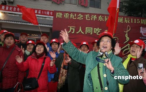 12月26日,一支來(lái)自北京的旅游團(tuán)隊(duì)在毛澤東家鄉(xiāng)韶山村高歌《東方紅》。當(dāng)天是毛澤東誕辰115周年,人們以這種方式抒發(fā)對(duì)毛主席的敬仰和懷念之情。中新社發(fā) 鄧霞 攝