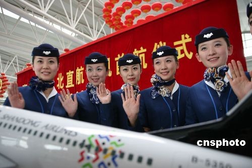 十二月二十六日下午三點(diǎn),青島-臺(tái)北直航班機(jī)從青島流亭國(guó)際機(jī)場(chǎng)起飛,駛向臺(tái)北桃園國(guó)際機(jī)場(chǎng),拉開青島臺(tái)北兩市直航的序幕。此后,每周二、周五各有一班常態(tài)包機(jī)航班從青島直飛臺(tái)北。青島臺(tái)灣直航后,旅程由原來七個(gè)小時(shí)縮短到兩個(gè)半小時(shí),費(fèi)用節(jié)約百分之三十,實(shí)現(xiàn)兩岸一日生活圈的夢(mèng)想。圖為在首航直飛包機(jī)航班上服務(wù)的部分乘務(wù)人員在慶祝直航儀式上。中新社發(fā) 王群 攝
