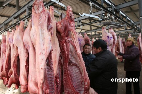 1月22日下午,河南省開封市南郊一生豬定點(diǎn)屠宰廠里人們正在批發(fā)豬肉。春節(jié)將至,開封市豬肉市場生意日益紅火。有關(guān)部門加大市場監(jiān)管力度,堅(jiān)決杜絕經(jīng)營私屠濫宰肉、注水肉、超期變質(zhì)肉、假冒品牌肉、缺少證照等違法現(xiàn)象,讓人民群眾吃上“放心肉”。中新社發(fā) 凱楓 攝
