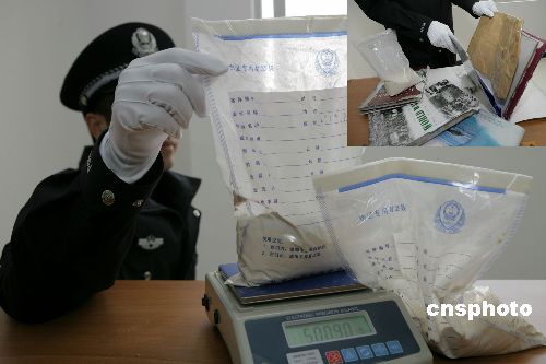 二月三日,福州海關(guān)緝私警察展示新繳獲的毒品海洛因。連日來(lái),福州海關(guān)駐長(zhǎng)樂(lè)機(jī)場(chǎng)辦事處旅檢關(guān)員在對(duì)吉隆坡-廣州-福州航班進(jìn)行監(jiān)管時(shí),連續(xù)查獲三起東南亞籍旅客涉嫌走私毒品入境案件,共繳獲毒品海洛因凈重四千六百七十七點(diǎn)六克,抓獲犯罪嫌疑人三名。中新社發(fā) 陳多 攝