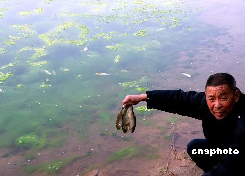 2009年3月10日,湖北省荊門市掇刀區(qū)麻城鎮(zhèn)胡沖村農(nóng)民鄭家清承包的魚塘暴發(fā)藍藻,導致不久前投放的價值2000多元的魚苗缺氧成批死亡。據(jù)鄭家清稱,他承包的16畝魚塘近幾年來在春夏時節(jié)不同程度的暴發(fā)藍藻,需要用藍礬(五水硫酸銅)才能將藍藻滅掉。中新社發(fā) 劉君鳳 攝