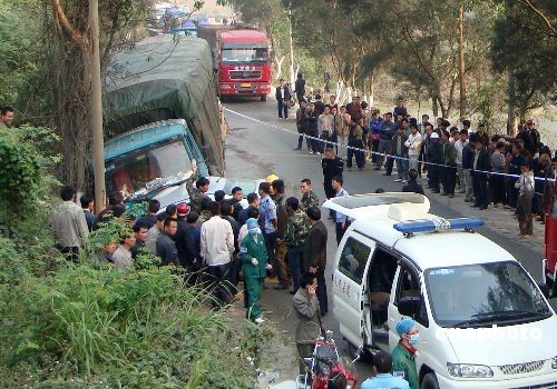 3月12日早上,廣西百色市田林縣境內(nèi)一輛奇瑞QQ小汽車在彎道處超車時(shí),不慎撞上迎面而來的一輛貴州籍大貨車,造成QQ車上兩人一死一傷。中新社發(fā) 唐廣斌 攝