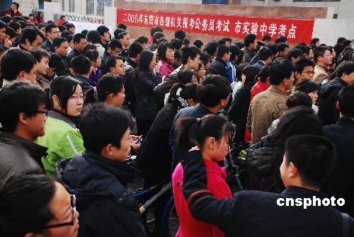 3月15日,參加山東公務(wù)員考試的考生們在山東東營市實(shí)驗(yàn)中學(xué)考點(diǎn)等待進(jìn)入考場。當(dāng)日,2009年度山東公務(wù)員考試公共科目筆試在全省同時(shí)舉行,共有39萬多人參加考試,競爭8685個(gè)崗位。中新社發(fā) 李波 攝