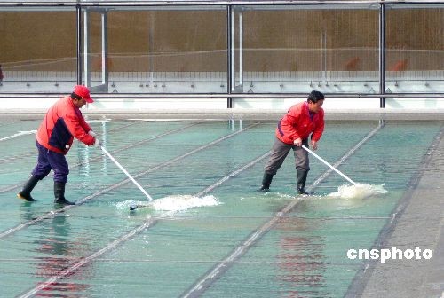 2009年3月26日,北京國家大劇院旁,兩名保潔員在認真清理景觀池玻璃上的積水,進行正常的維護保養(yǎng)。中新社發(fā) 玉龍 攝