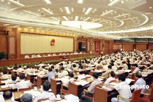 6月22日,十一屆全國人大常委會(huì)第九次會(huì)議在北京人民大會(huì)堂開幕,繼續(xù)審議農(nóng)村土地承包經(jīng)營糾紛仲裁法草案、統(tǒng)計(jì)法修訂草案、國家賠償法修正案草案;首次審議保守國家秘密法修訂草案、駐外外交人員法草案、海島保護(hù)法草案等。 全國人大常委會(huì)委員長(zhǎng)吳邦國主持會(huì)議。中新社發(fā) 盛佳鵬 攝
