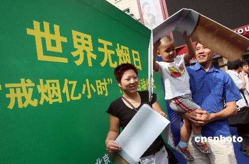 5月29日,一個(gè)家庭在北京王府井大街將香煙模型撅斷,這是由北京市愛衛(wèi)會(huì)主辦的世界無(wú)煙日暨“戒煙億小時(shí)”公益活動(dòng)現(xiàn)場(chǎng)。該活動(dòng)發(fā)出“戒煙一小時(shí),健康億人行”的戒煙口號(hào),號(hào)召“世界無(wú)煙日”(5月31日)當(dāng)天17點(diǎn)31分至18點(diǎn)31分之間戒煙一小時(shí)。據(jù)悉,中國(guó)是世界上煙草生產(chǎn)和消費(fèi)第一大國(guó),目前約有3.5億吸煙者,并且還在以每年300萬(wàn)的速度增長(zhǎng),控?zé)熜蝿?shì)極為嚴(yán)峻。中新社發(fā) 張宇 攝