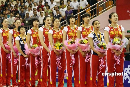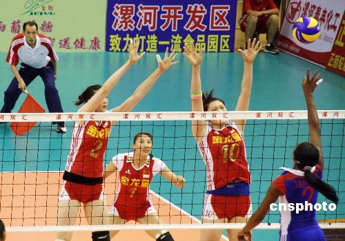 5月31日,2009年中國(guó)國(guó)際女排精英賽(漯河站)在河南省漯河市體育館展開最后一場(chǎng)爭(zhēng)奪,由東道主中國(guó)女排對(duì)壘美洲勁旅古巴女排,最終“小諸葛”蔡斌率領(lǐng)的中國(guó)隊(duì)3-0(25-17、25-21、25-15)狂勝對(duì)手,“蔡家軍”以三戰(zhàn)全勝的驕人戰(zhàn)績(jī)奪得首個(gè)冠軍。中新社發(fā) 李慧宇 攝