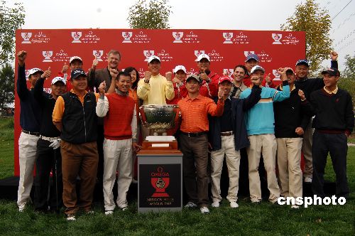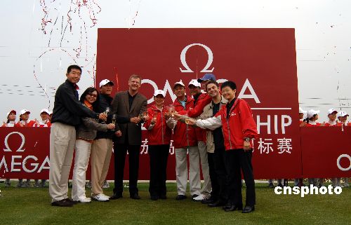 2007歐米茄中國(guó)巡回賽年度收官之站——歐米茄高爾夫球錦標(biāo)賽于10月18日至21日在北京天安假日運(yùn)動(dòng)俱樂(lè)部舉行,本站賽事獎(jiǎng)金總額80萬(wàn)人民。10月17日,國(guó)家體育總局小球中心副主任王立偉、歐米茄大中華區(qū)總裁盧克勤、歐米茄名人大使楊揚(yáng)、任達(dá)華,天安假日運(yùn)動(dòng)俱樂(lè)部董事程軍、歐米茄中國(guó)巡回賽球員張連偉共同出席開球儀式。中新社發(fā) 楊可佳 攝