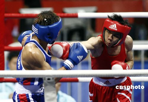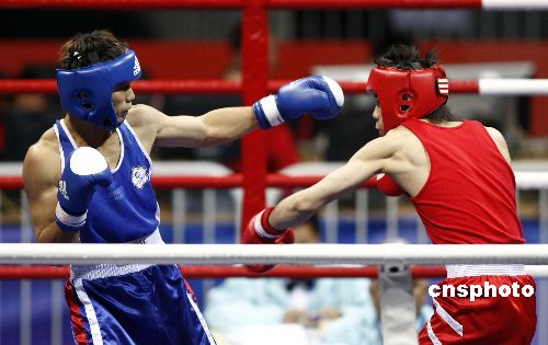 十一月十八日晚,“好運(yùn)北京”2007年國際拳擊邀請賽在北京工人體育館進(jìn)行預(yù)賽第三階段的比賽,在男子五十七公斤級的比賽中,中國香港選手曹聲揚(yáng)(紅色)在比賽中進(jìn)攻雖猛仍不敵中華臺北選手鐘俊安(藍(lán)色)。本次邀請賽有來自十七個國家和地區(qū)的十八支隊伍參加,采用單敗淘汰制方式,進(jìn)行預(yù)賽、半決賽、決賽共七十場比賽,比賽時間為十一月十七日至二十二日。中新社發(fā) 盛佳鵬 攝