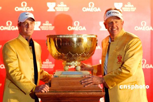 蘇格蘭隊(duì)選手科林.蒙哥瑪利(右)/馬克.沃倫十一月二十五日經(jīng)過四輪鏖戰(zhàn)以負(fù)二十五桿的總成績(jī)奪得在深圳舉辦的歐米茄觀瀾湖高爾夫世界杯冠軍。中新社發(fā) 陳文 攝