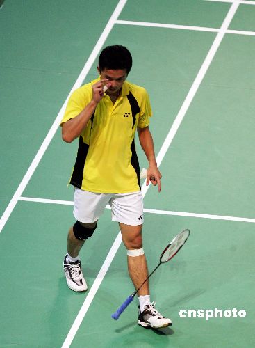 十一月三十日晚,世界排名第一的中國選手林丹在二零零七中國香港羽毛球超級(jí)賽上以二比零戰(zhàn)勝印尼名將陶菲克,晉級(jí)四強(qiáng)。圖為陶菲克在比賽中摔拍。中新社發(fā) 武仲林 攝
