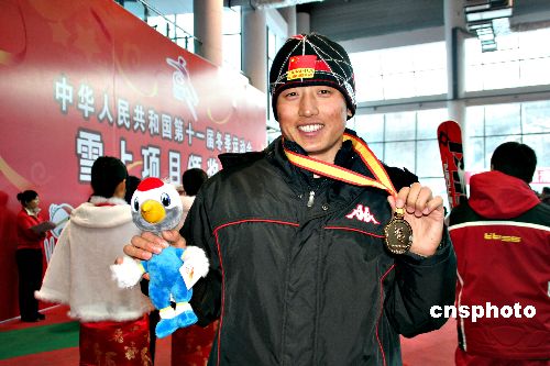 2008年1月21日下午3時30分,在哈爾濱亞布力雪具庫大廳,高山滑雪男子大回轉(zhuǎn)在此頒獎。哈爾濱代表隊李光旭摘得冠軍。據(jù)悉此項女子賽事明天將繼續(xù)進行。中新社發(fā) 姚庭山 攝