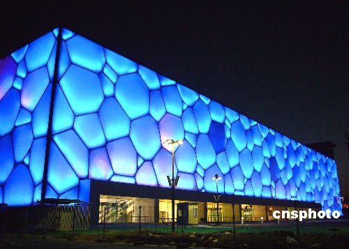 2008年1月23日晚,經(jīng)過清洗的“水立方”外膜透光度明顯增加,在藍色主燈光的照射下更加晶瑩剔透,其間閃爍變幻的紅、黃、綠燈光組合也更加鮮艷奪目,呈現(xiàn)出色彩斑斕如詩如畫的夢幻佳境。中新社發(fā) 玉龍 攝