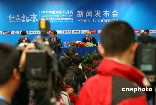 1月29日,在“水立方”召開(kāi)的中國(guó)游泳公開(kāi)賽新聞發(fā)布會(huì),吸引各國(guó)媒體爭(zhēng)相報(bào)道。中國(guó)游泳公開(kāi)賽是在國(guó)家游泳中心——水立方舉行的首場(chǎng)比賽。中新社發(fā) 富田 攝