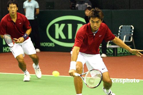 2月9日,2008年戴維斯杯亞大區(qū)II組中國隊vs黎巴嫩隊比賽在北京國際網(wǎng)球中心進(jìn)行了第三場雙打比賽的較量。于欣源/曾少昡 以6:2,7:6(4),6:2戰(zhàn)勝黎巴嫩的吉桑·扎阿蒂尼/帕蒂克·楚克里雙打組合。盡管后兩場單打還沒進(jìn)行,中國隊總比分3:0已經(jīng)確保勝利晉級下輪。中新社發(fā) 富田 攝