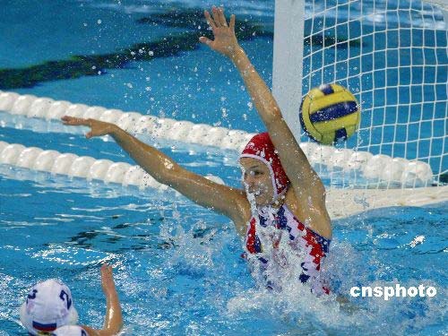 3月18日,十七年前建成的北京奧林匹克體育中心內(nèi)的英東游泳館(由已故香港愛國人士霍英東先生出資修建)經(jīng)過一年多的整修后,迎來北京奧運會測試賽!昂眠\北京”2008中國水球公開賽在奧體中心英東游泳館打響了揭幕戰(zhàn)。首日進行的是女子組比賽,東道主中國隊以6-9的比分,負于了悉尼奧運會冠軍澳大利亞隊。中新社發(fā) 富田 攝