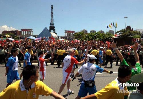 5月8日,奧運圣火在深圳進(jìn)行傳遞。在深圳世界之窗門前芬蘭籍火炬手芬蘭前奧委會主任塔帕尼·愛爾卡與火炬手高正榮交接后向前傳遞圣火。中新社發(fā) 廖攀 攝