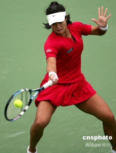 9月23日,在2008中國網(wǎng)球公開賽女子單打首輪比賽中,中國選手李娜以0比2不敵意大利選手斯齊亞沃尼,被淘汰出局。中新社發(fā) 富田 攝
